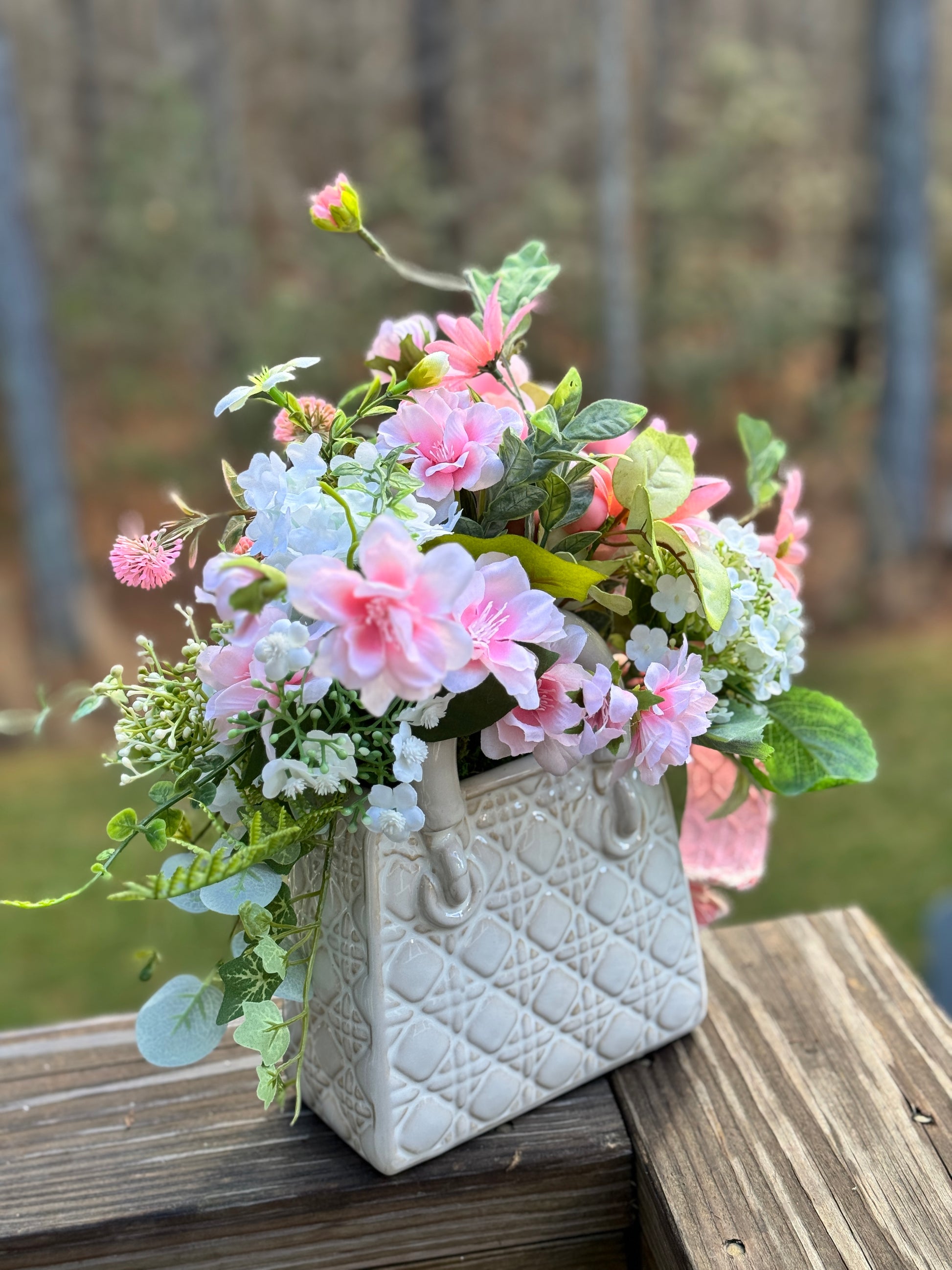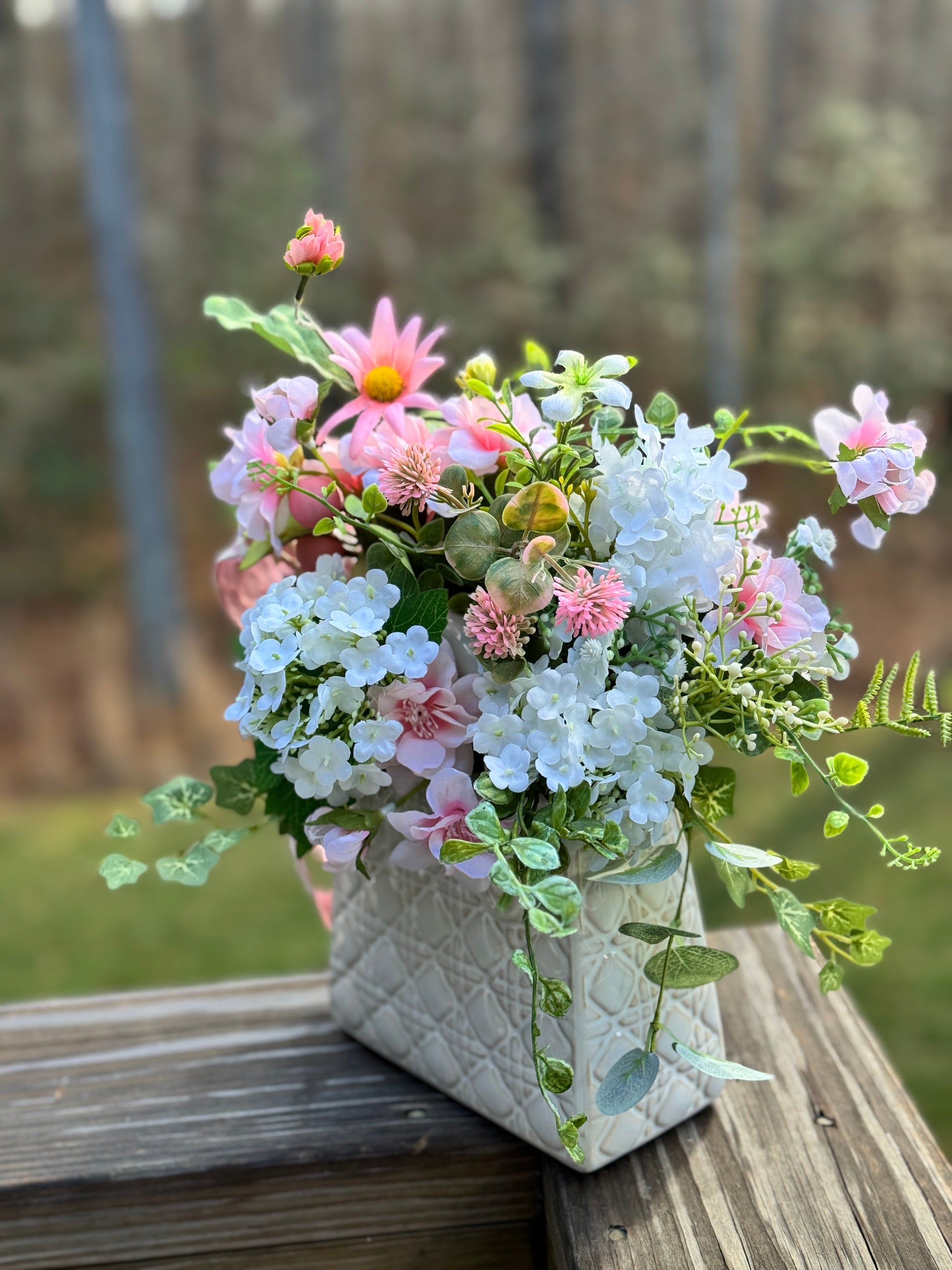 Enhance your home with this elegant floral arrangement. Featuring pink azaleas and white mini hydrangea blooms with a variety of gorgeous greenery in a stylish white quilted vase, it's perfect for adding a touch of nature indoors and as a gift for Valentine’s Day, Mother’s Day, Easter and more! Measures 13x14x8”