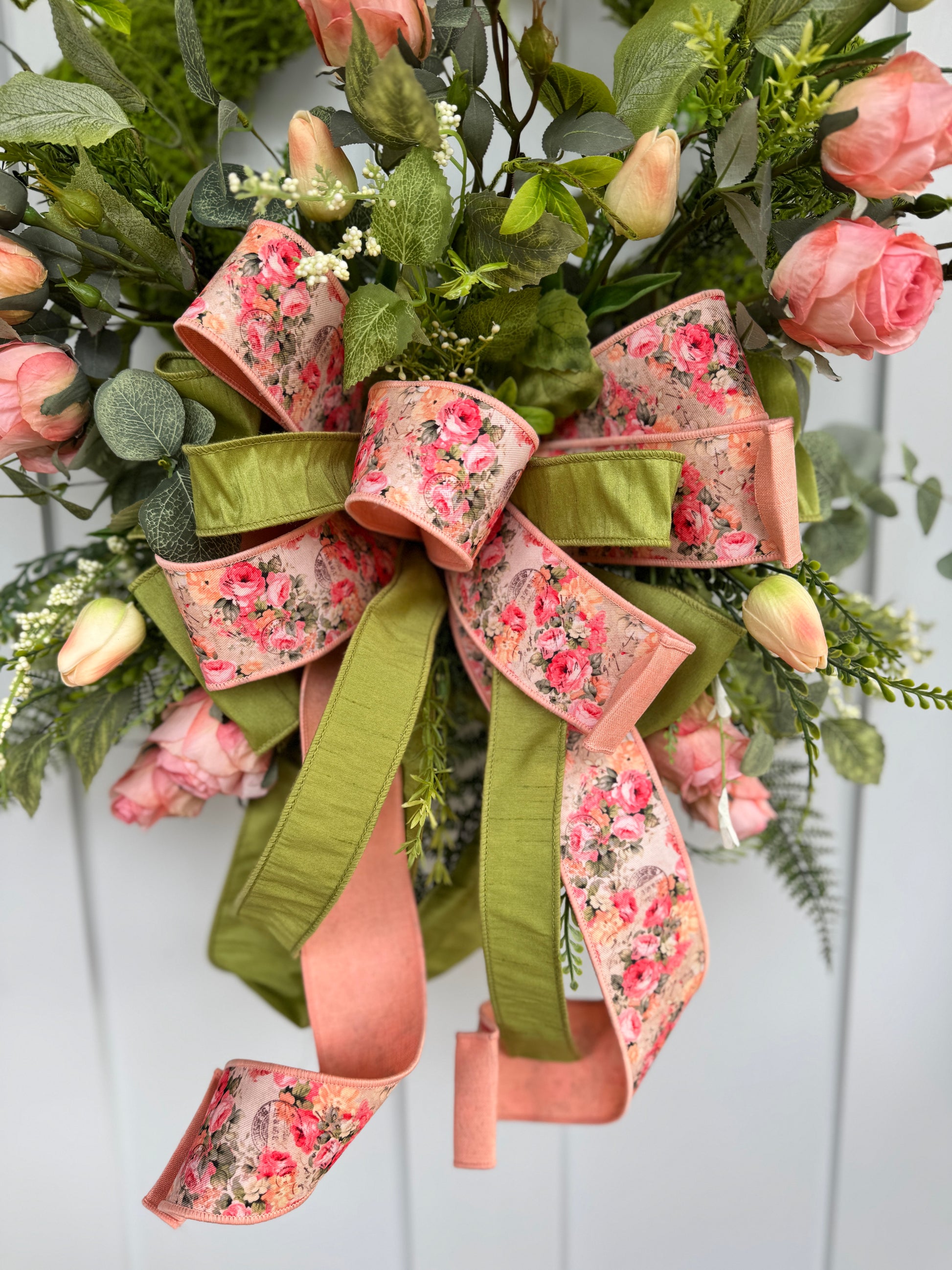 Beautiful moss based wreath with a vintage inspired design featuring coral roses and cream real touch tulips with coral tips and spring mixed foliage such as fern, beaded fern, whimsical pieces, and more! A beautiful handmade bow with D’Lux ribbon in spring and vintage double sided fuses vintage floral ribbon. Perfect for adding a touch of elegance to any to your home. Measures 21x31x10” from top of moss wreath to the bottom of ribbon and greenery. A ribbon on top adds an additional 14”. This ribbon can easily be removed if needed.