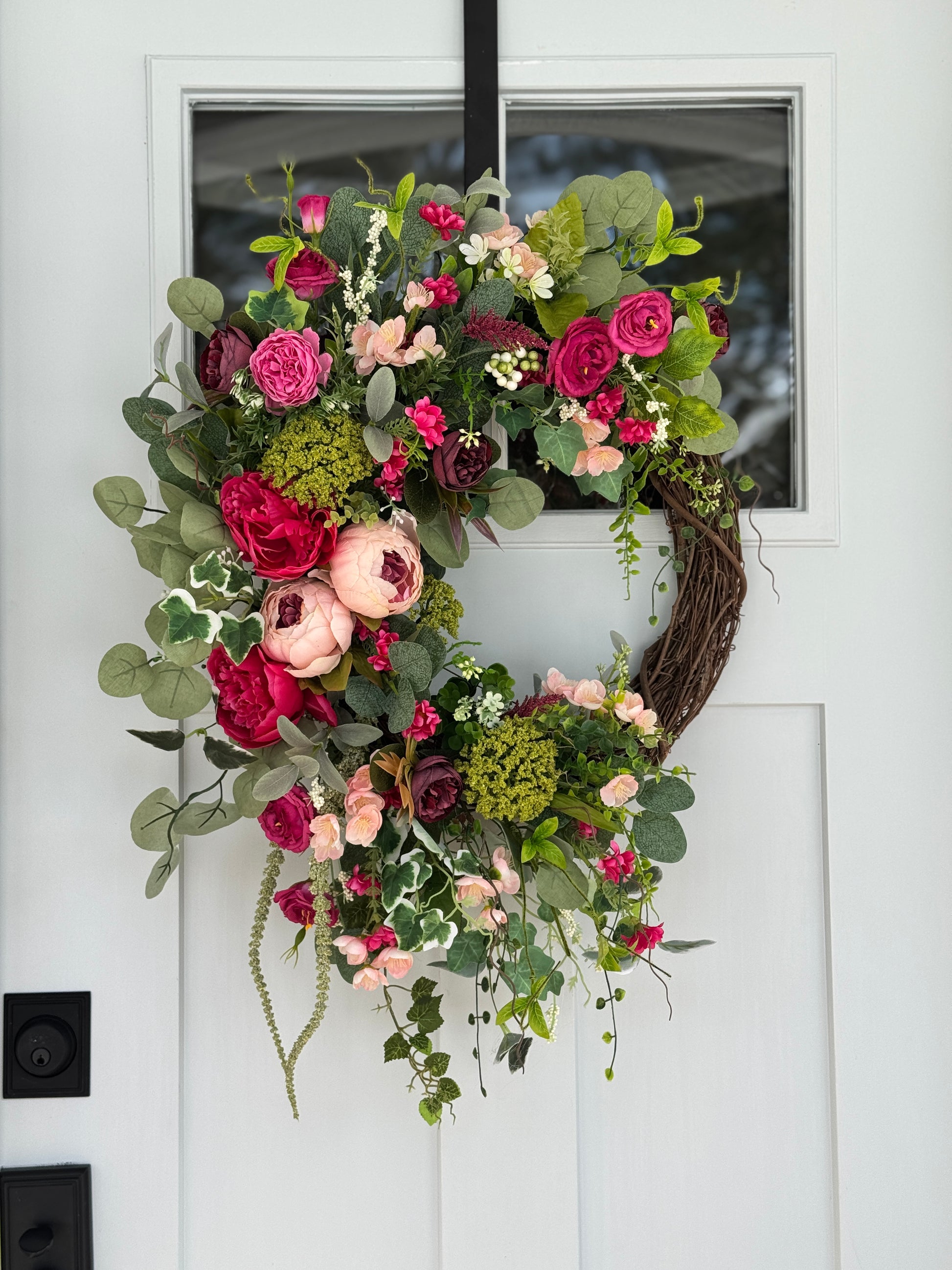 Elegant and cozy floral wreath featuring pink peonies, light mauve peonies, buttercups, green floral accents, ivy and more!and green. Perfect for a warm greeting for guests. Measures 22x32x9”