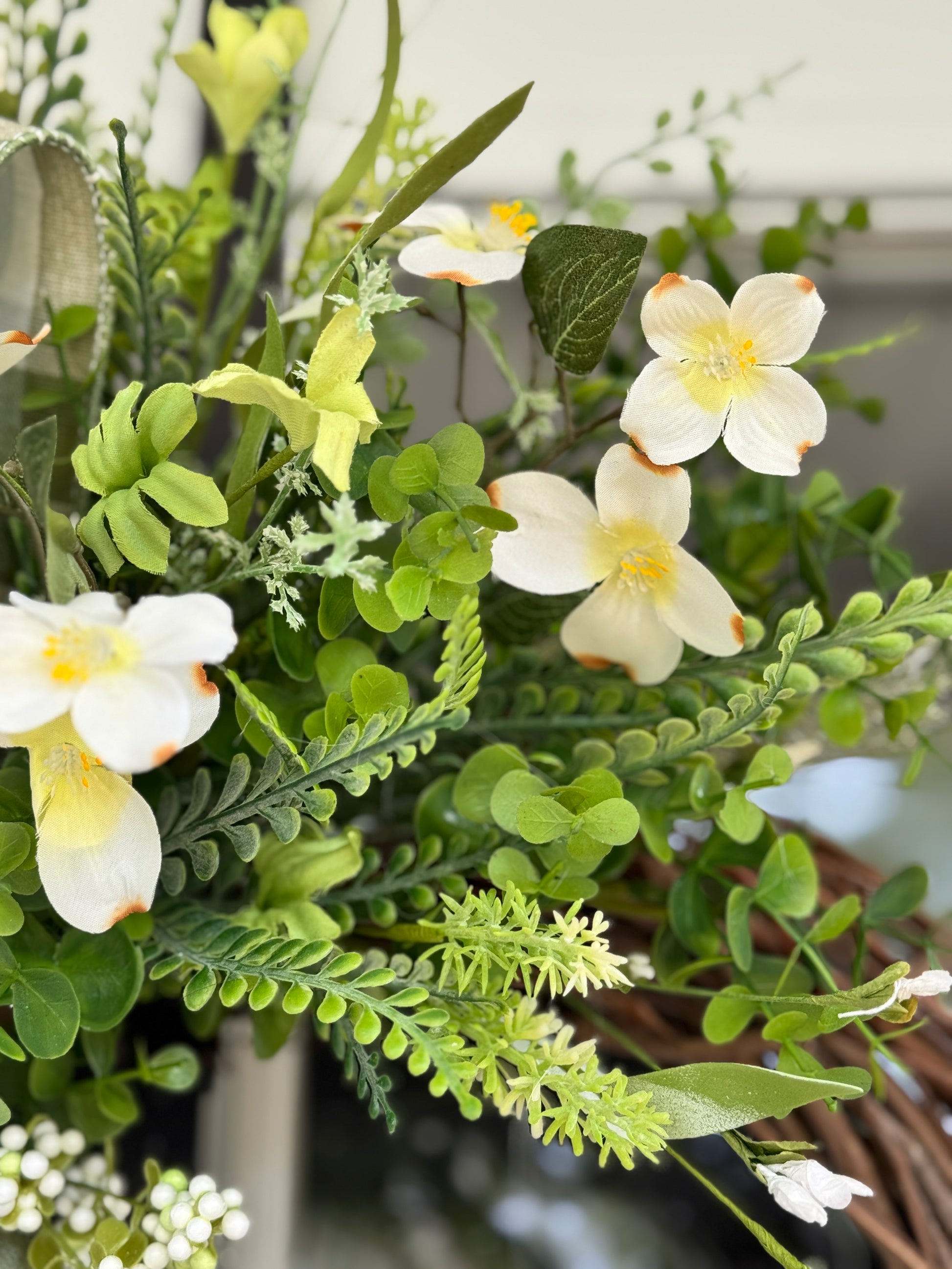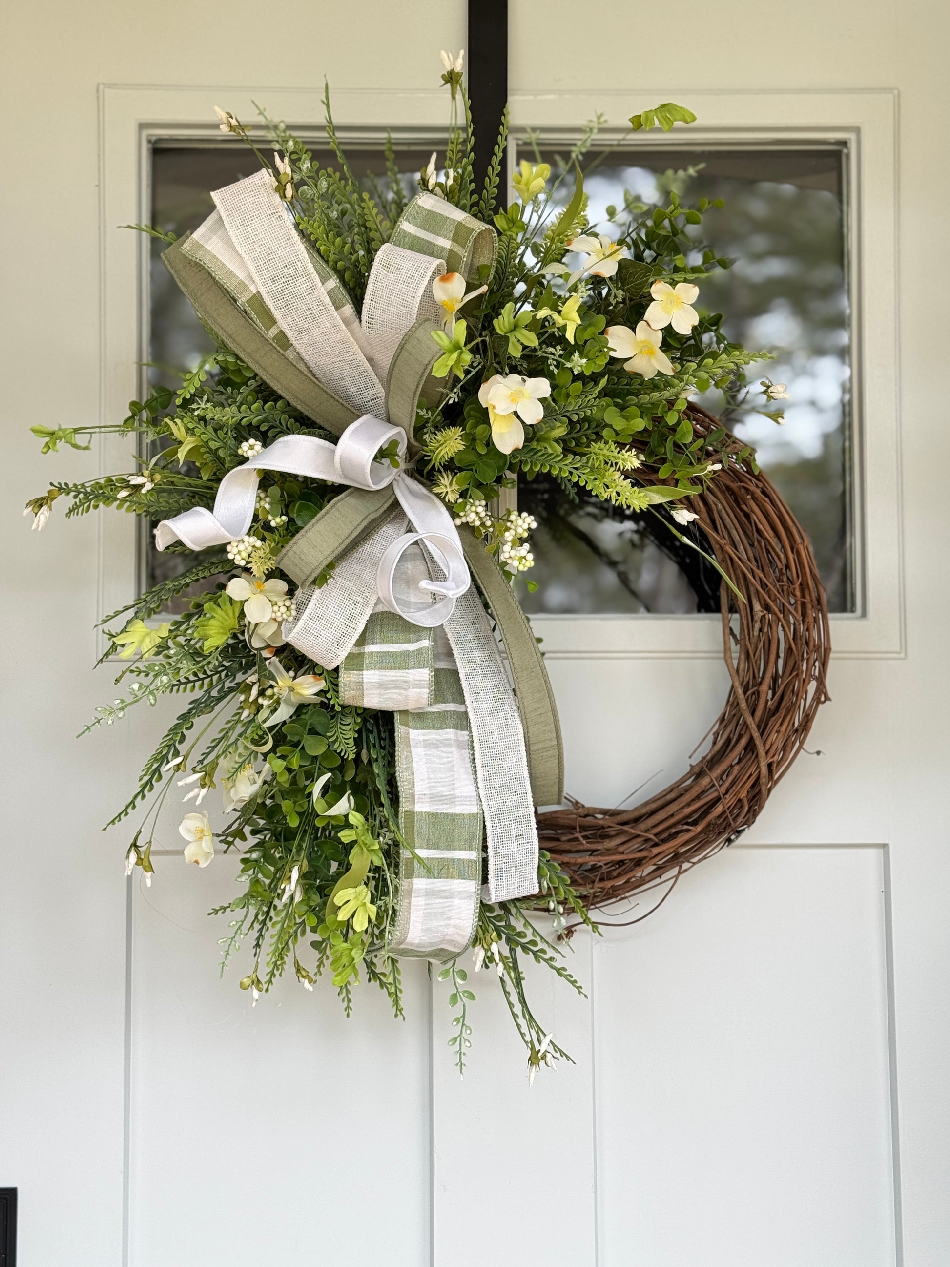 Enhance your home year round with this elegant wreath featuring Dogwood flowers, light spring green accents and lush green foliage with a large handmade bow with sage and white plaid bow. Perfect for adding an elegant touch to any door. Measures 23x26x7”