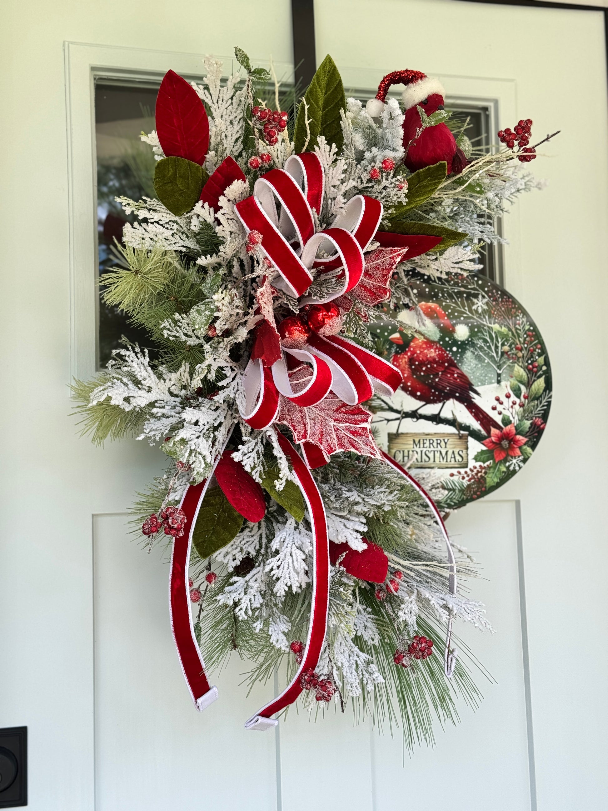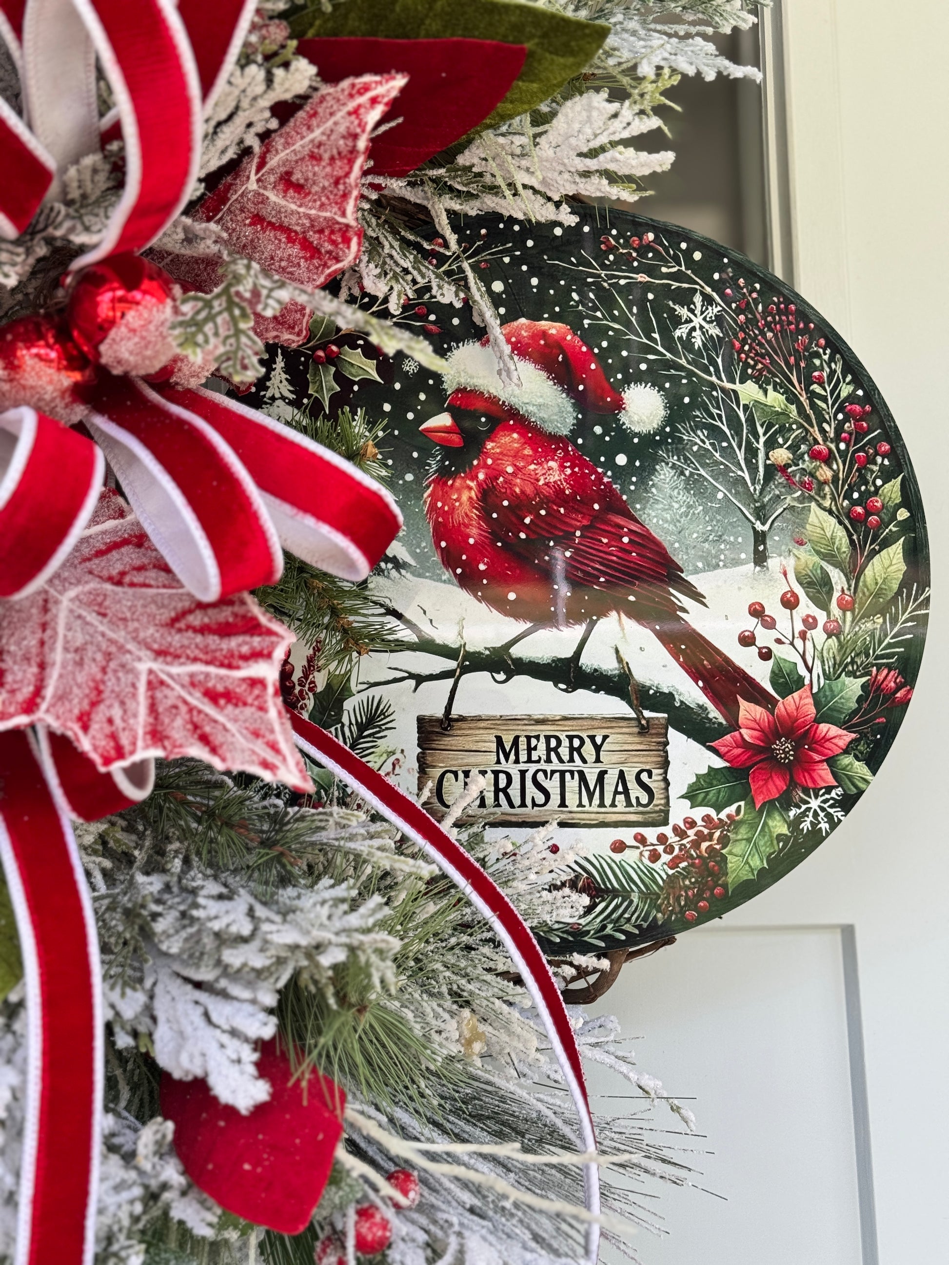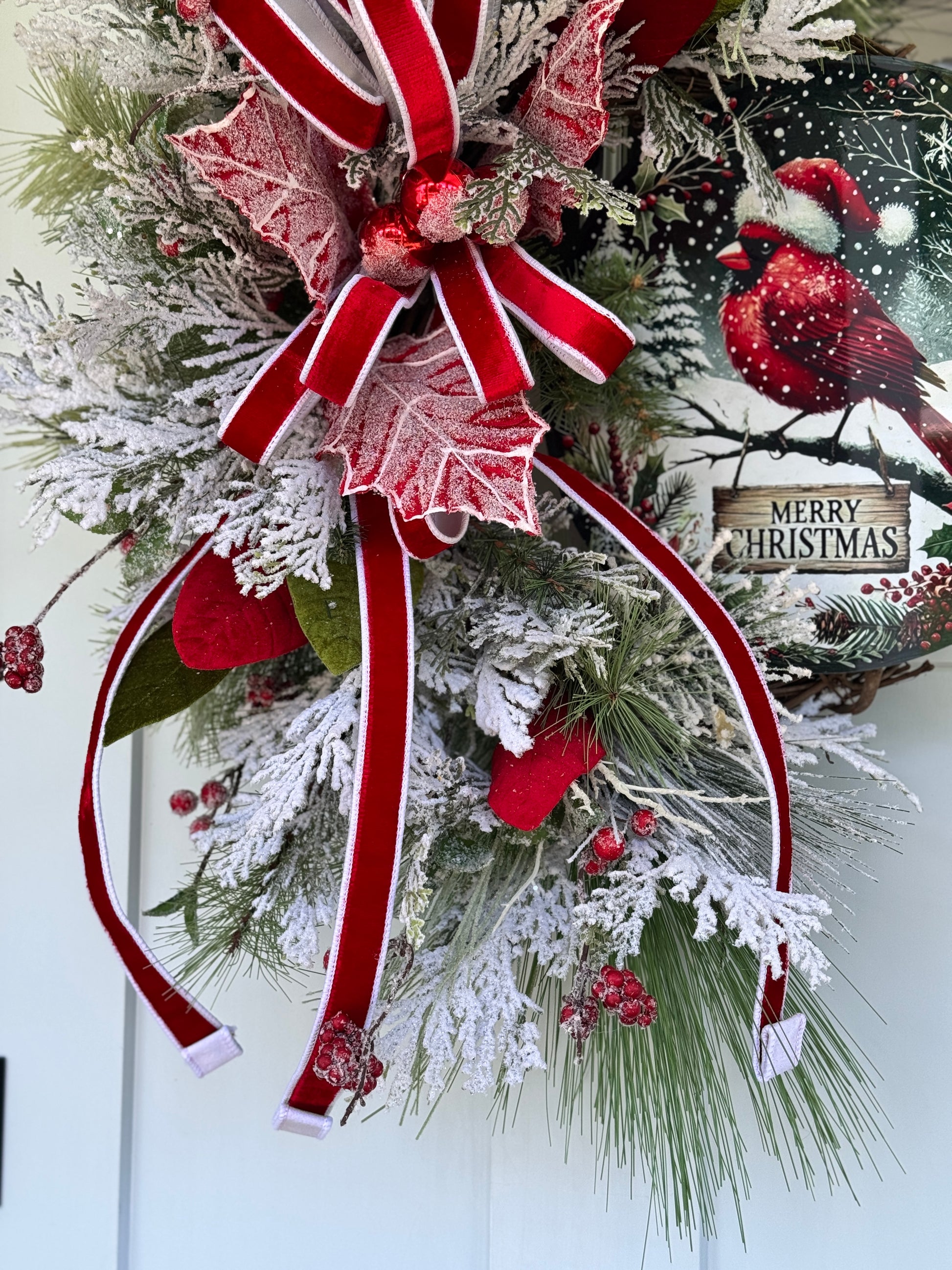Celebrate the winter and Christmas season with this stunning holiday wreath featuring a metal sign with a Cardinal wearing a Santa Hat sitting on a branch enjoying the peaceful Winter scene. The wreath is made of a mix of long needle pine, snowy cedar and iced red berries and velvet red and green magnolia leaves. Beautiful handmade bow made of two toned Farrisilk velvet ribbon with multiple tails. Sign can easily be removed and added back to last through all of Winter and the holidays. Perfect for adding a festive touch to your home decor. Measures 23x29x10”