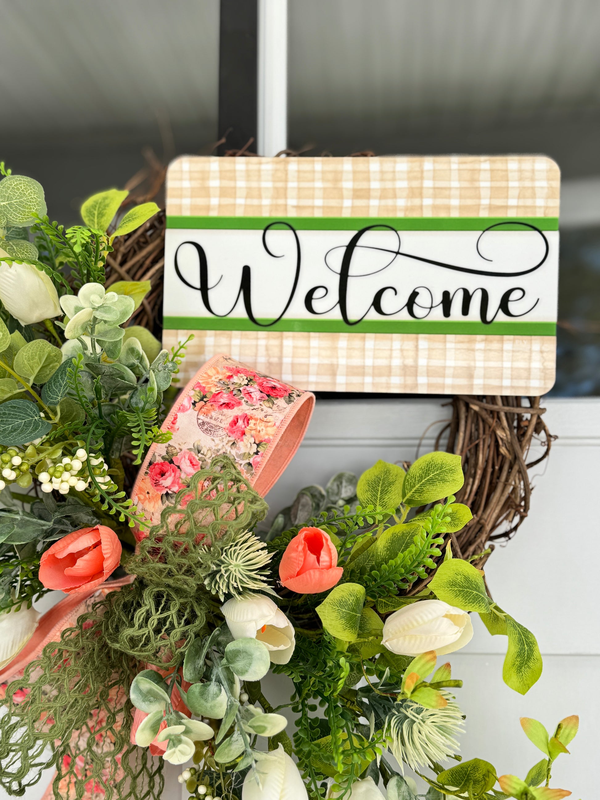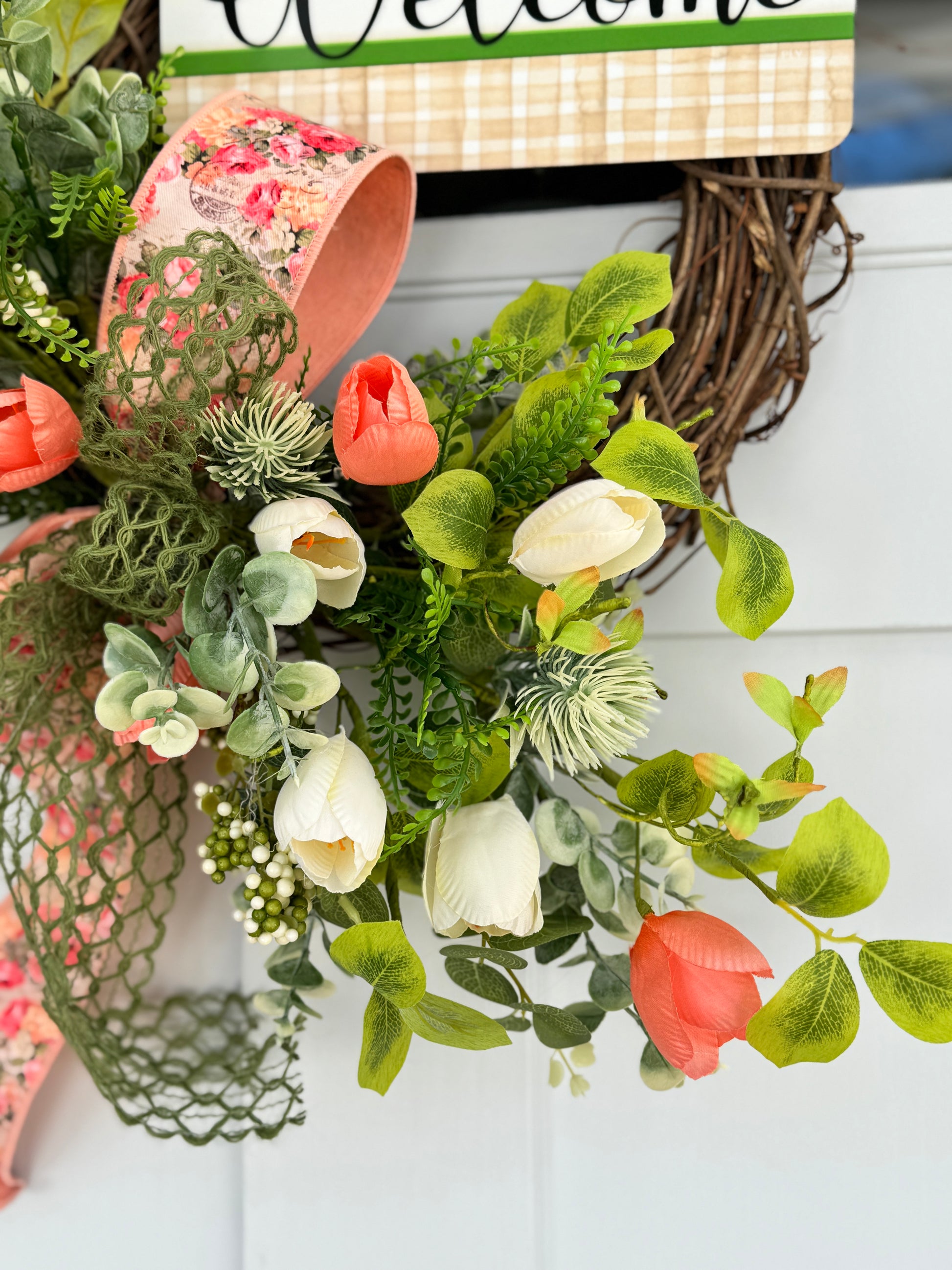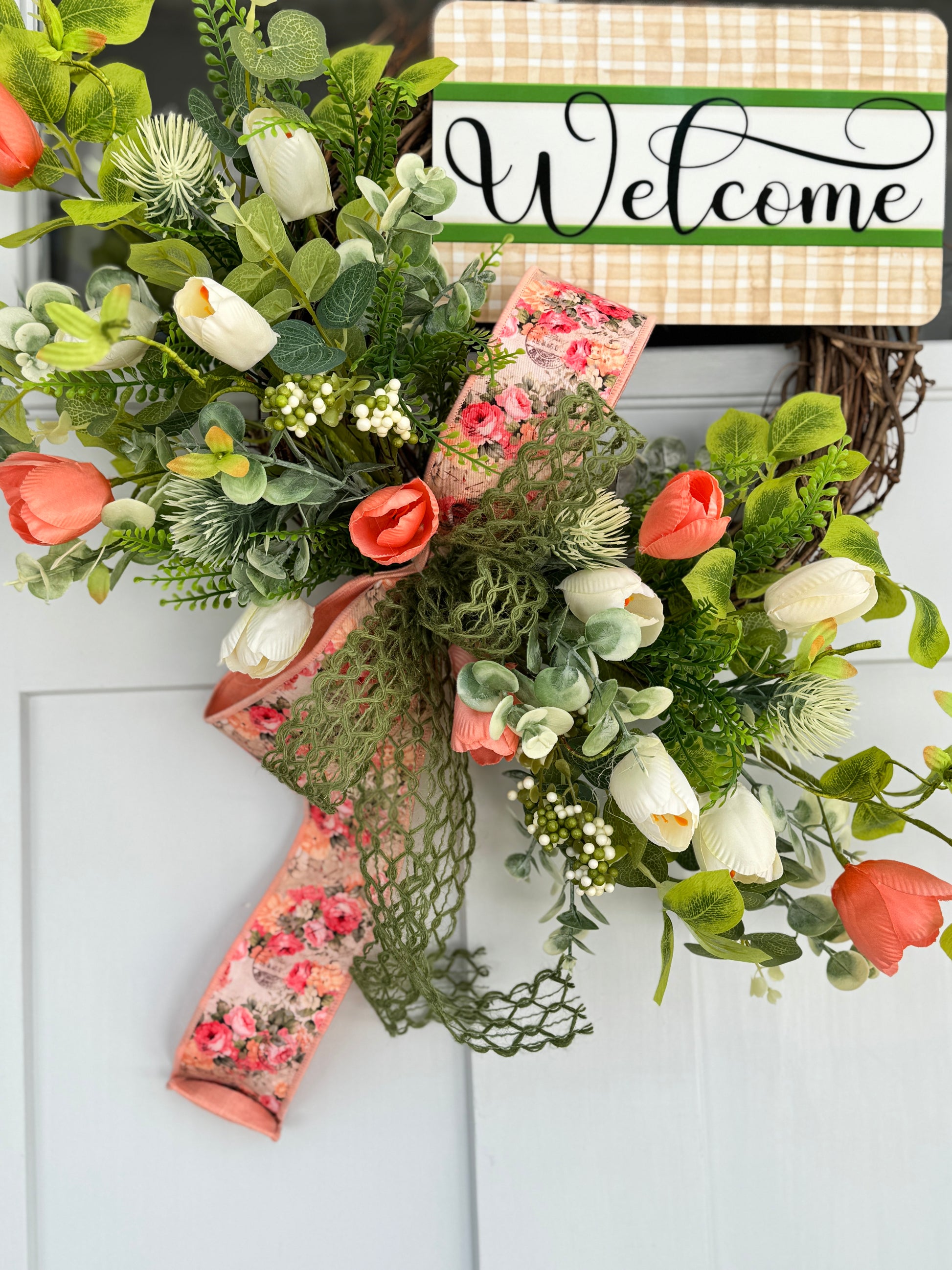 Beautiful wreath featuring sweet coral and cream tulips and spring greenery with a metal Welcome sign for guests. Designer double sided coral ribbon with weaved moss colored ribbon. Perfect for welcoming guests. Measures 19x21x7”