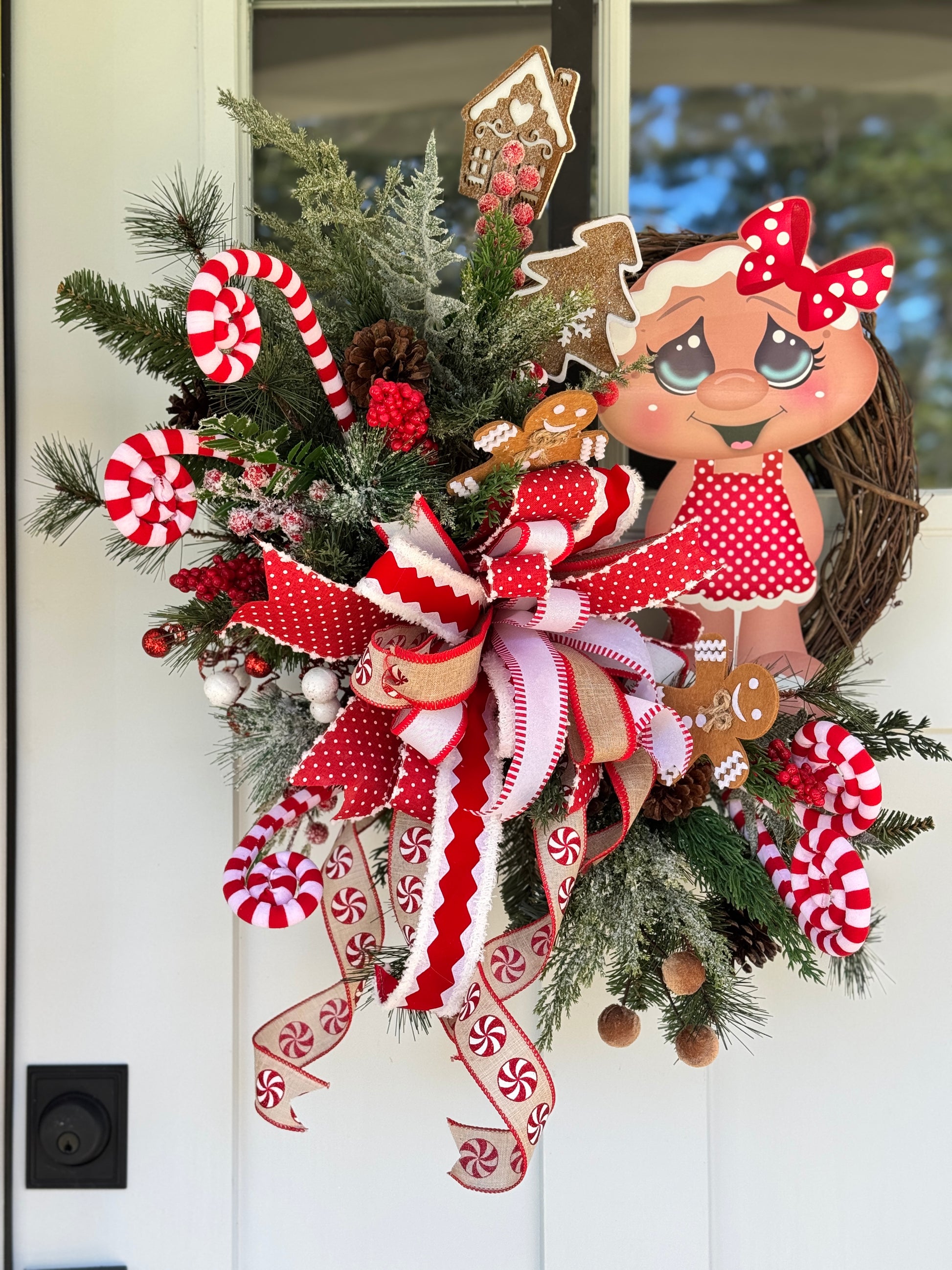 Charming holiday wreath featuring an adorable metal gingerbread girl sign with red and white polka dots outfit and bow. Also included in this whimsical design are multiple candy cane curls, red berries, brown velvet accent, and gingerbread house, tree and gingerbread person accents. Large handmade bow with a red and white color trend makes this a showstopper! Measures 22x26x9”