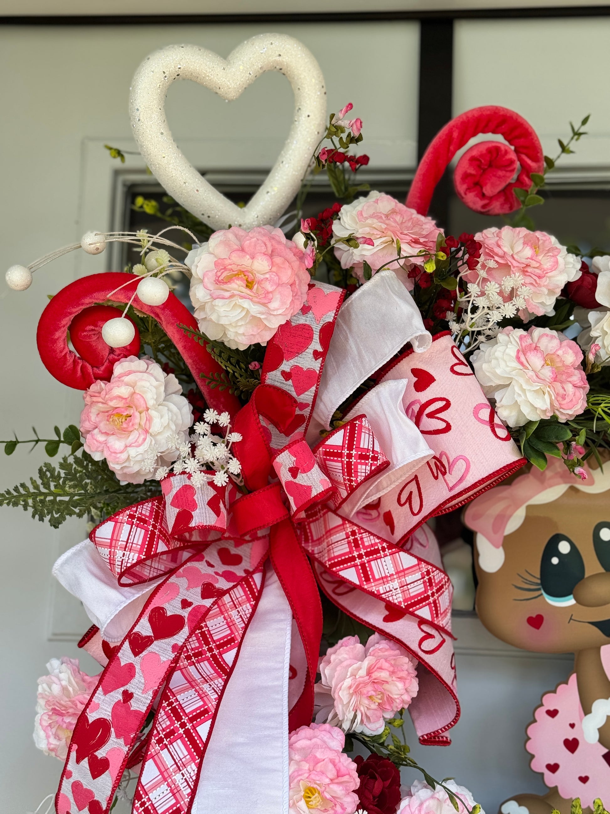 Celebrate love with this charming Valentine's Day wreath featuring pink and white flowers with red mini roses, white glittery heart and three decorative pink curl accents with spring greenery. and red accents. A beautiful bow of red, pink and white is elevates the whimsical feel of this wreath. Perfect for adding a festive touch to your home decor and a bright and charming welcome for guests. Measures 23x34x9”