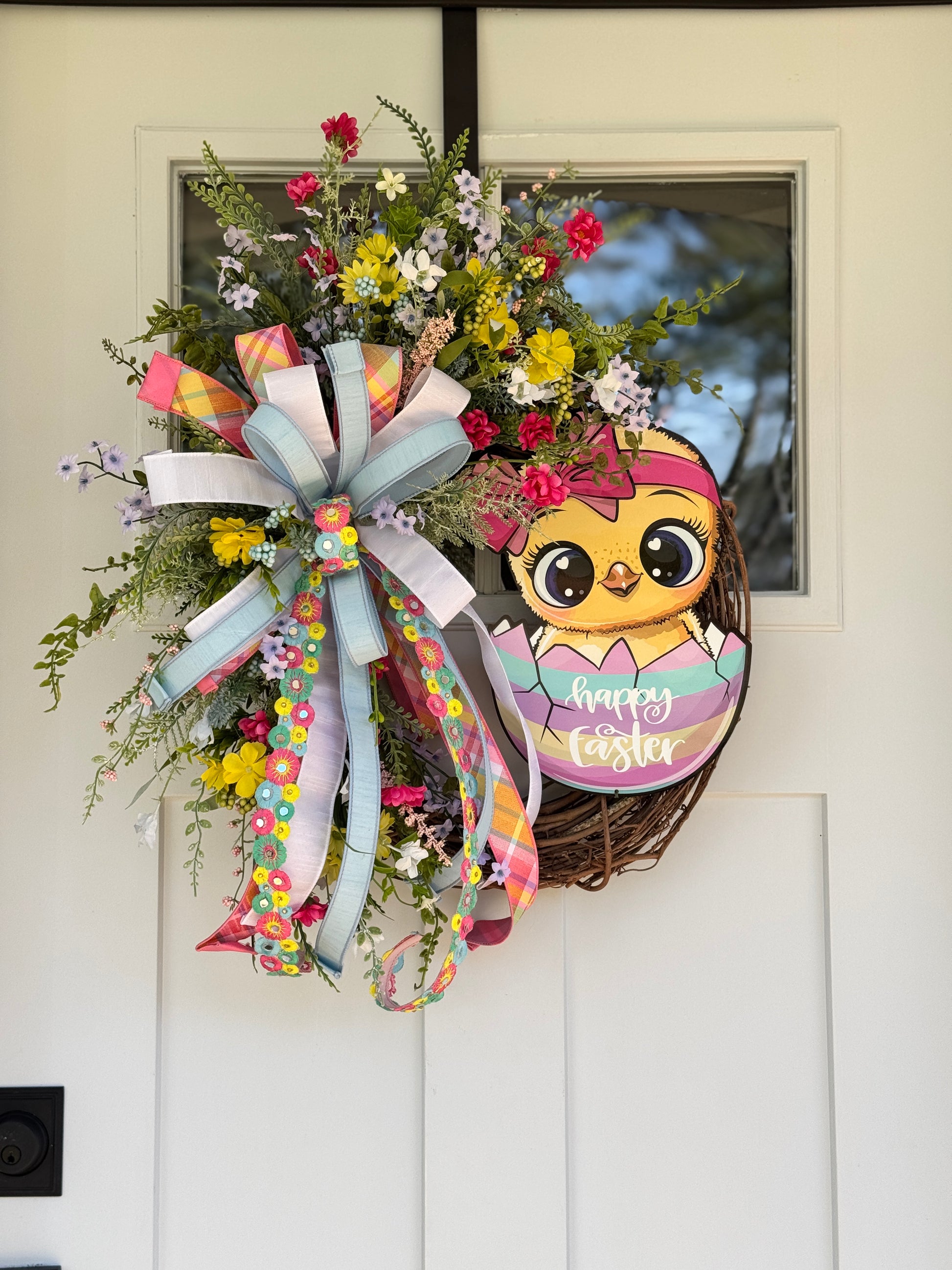Brighten your home with this charming Easter Chick Wreath. Featuring vibrant pink, lilac, yellow, blue and green accents, it's perfect for adding a festive touch to your holiday decor. Beautiful handmade bow made with double sided plaid ribbon, and two Farrisilk designer ribbons including embroidered flower ribbon. Measures 23x28x8”