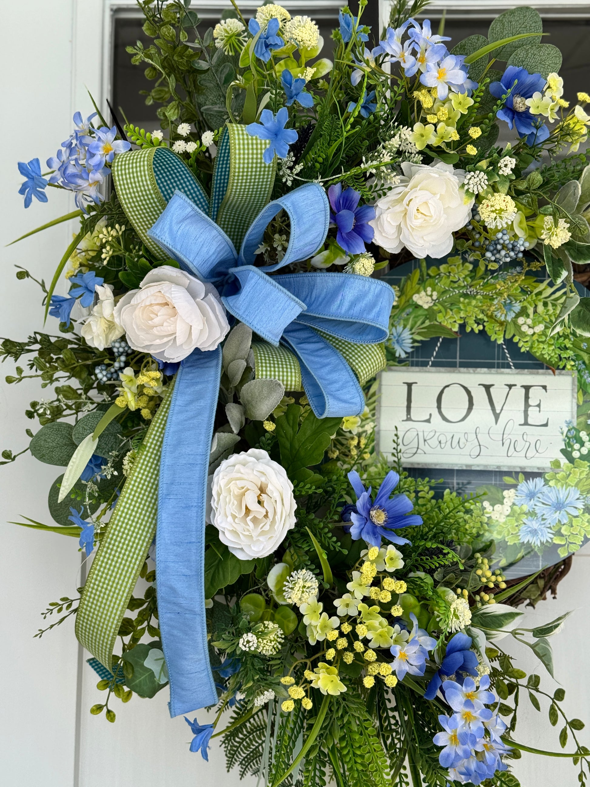 Beautiful floral wreath featuring a metal sign with gray, blue, green and cream hues and a heartwarming message that “Love Grows Here”. Floral design is made of a variety of blue flowers such as cosmos, wildflowers, white roses, green filer flowers and a large handmade bow made with two designer Farrisilk ribbons of solid blue and reversible plaid ribbon with green and blue on opposite sides. Measures 21x29x8”