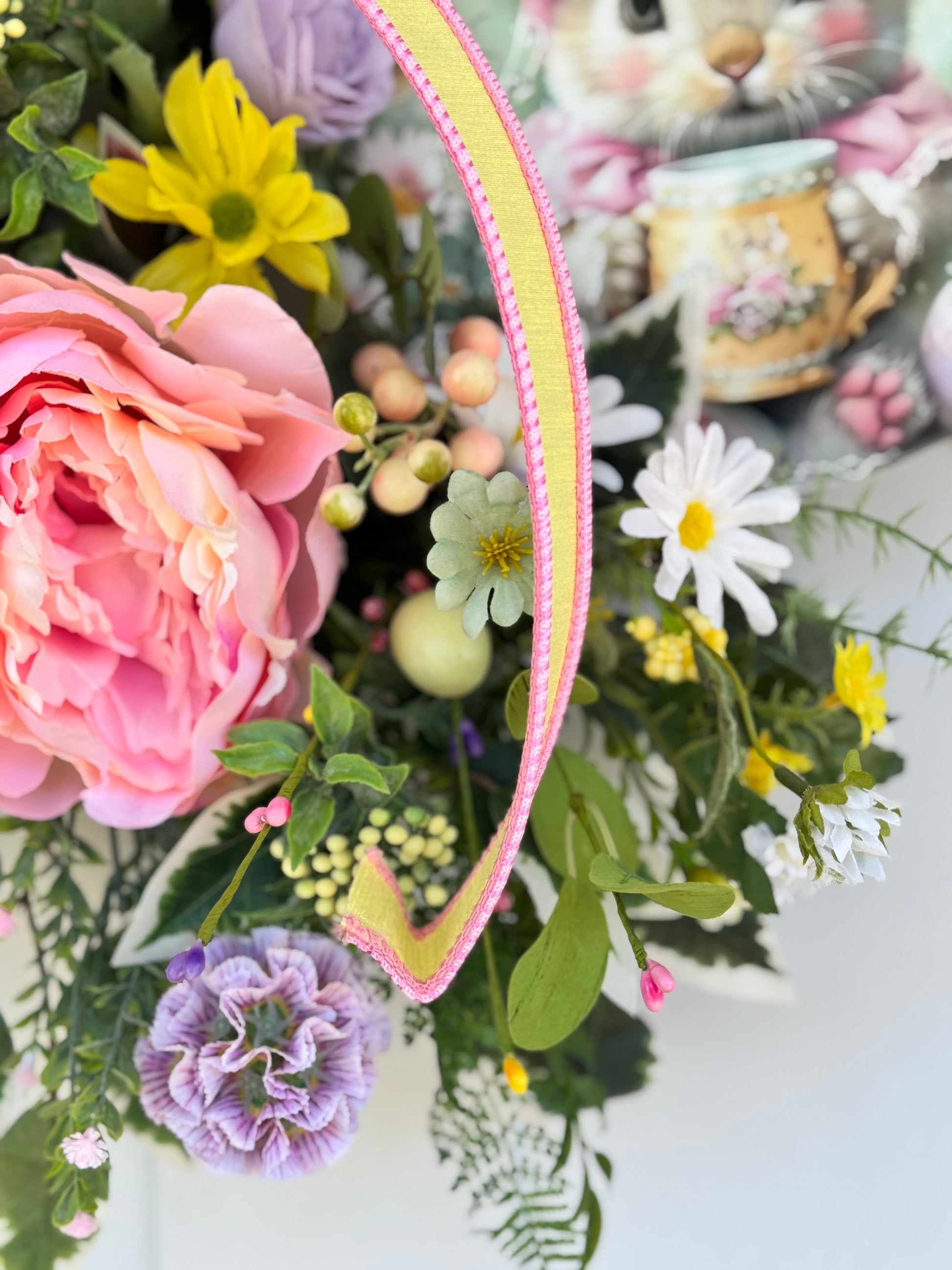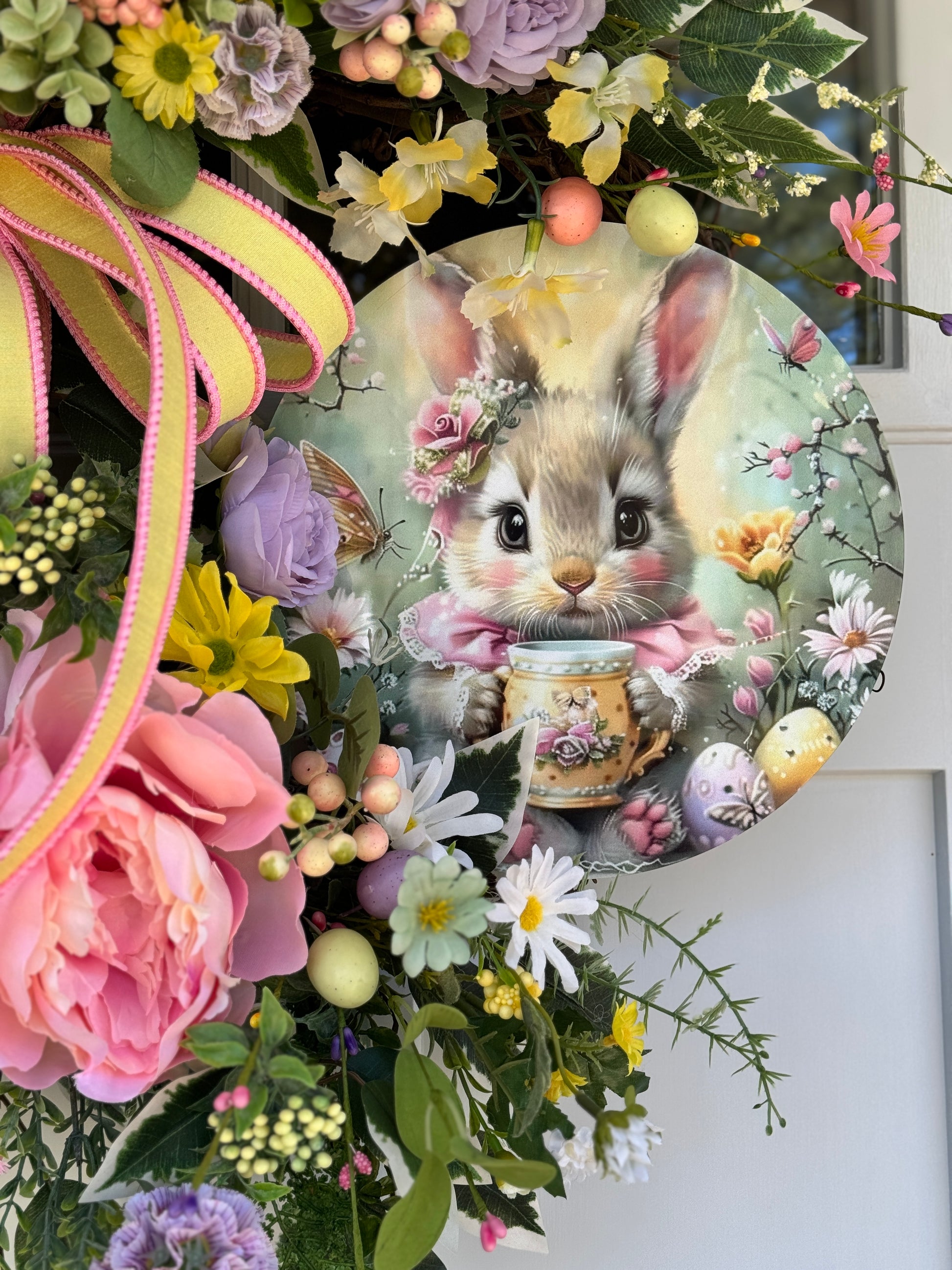 Brighten your home with this beautiful spring floral wreath. Featuring a metal sign with bunny and soft colors, pink open peonies, and yellow daisies, lavender flowers and a large handmade bow made with Farrisilk ribbon in the color yellow with pink trim, it's perfect for adding a touch of color to your decor. Measures 24x26x8”