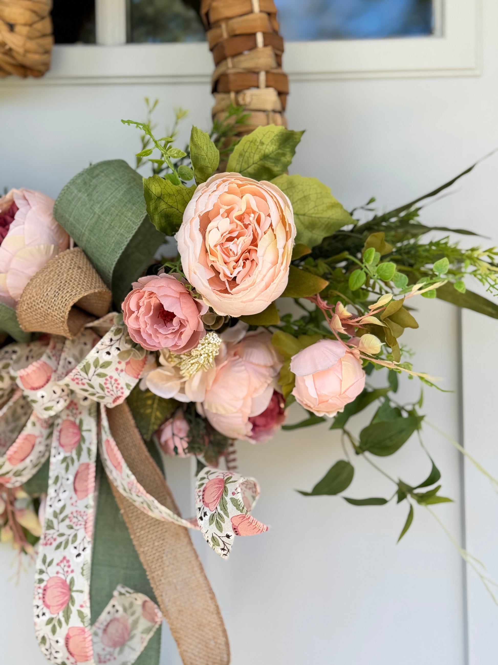 Beautiful heart-shaped rattan woven wreath base adorned with pink and champagne peonies and greenery whimsical greenery with a sweet handmade bow of peony ribbon and sage. Perfect for Valentine’s Day through summer with its sweet and romantic feel. Measures 24x25x8” as it hangs in the photos. There is a string attached for hanging if you prefer a more vertical display.