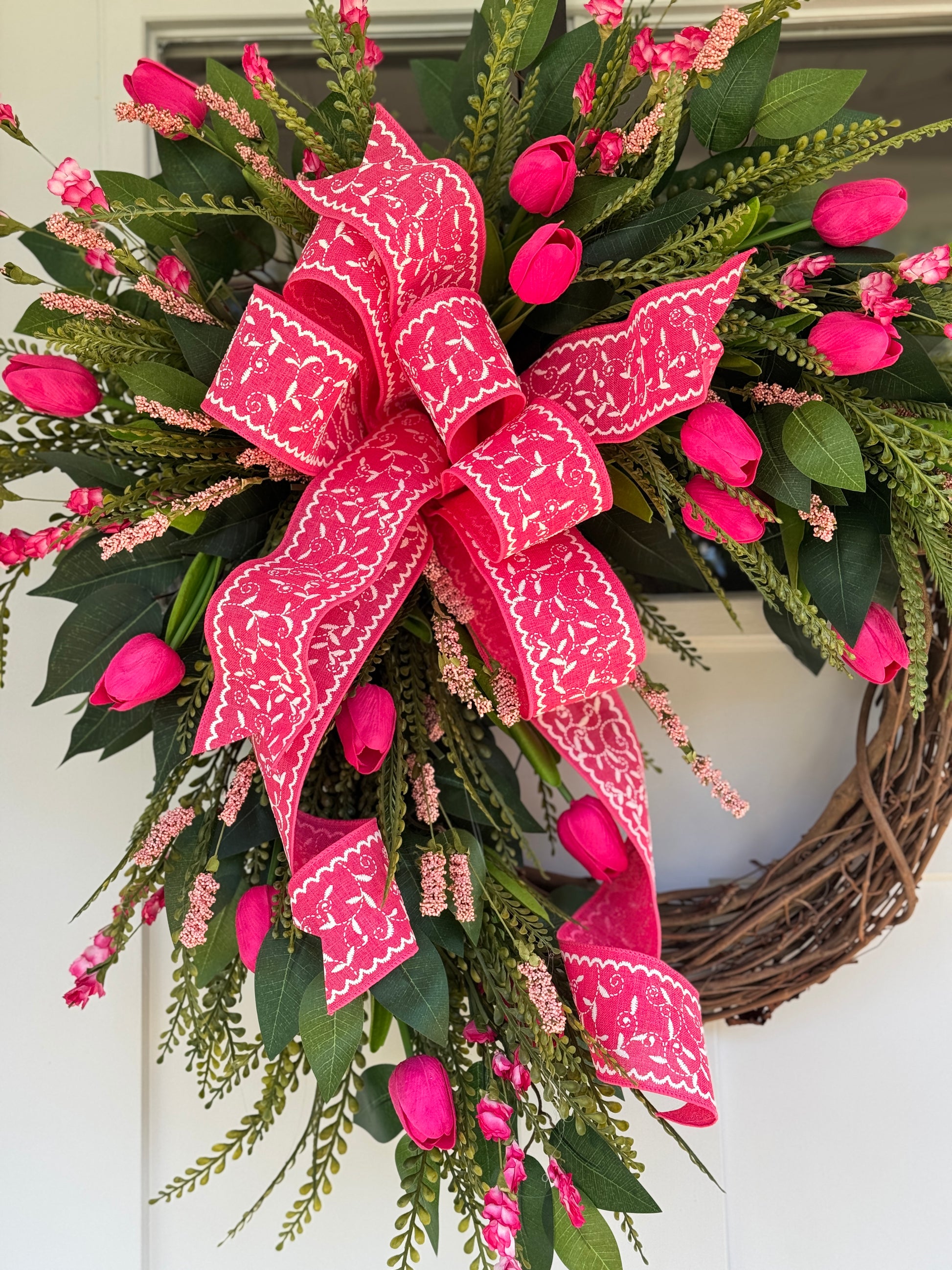 Brighten your home with this stunning hot pink tulip wreath, featuring Real Touch Tulips, pink accents, lush foliage and a large vibrant bow with multiple tails. Perfect for adding an eye-catching touch to your decor. Measures 27x28x9”