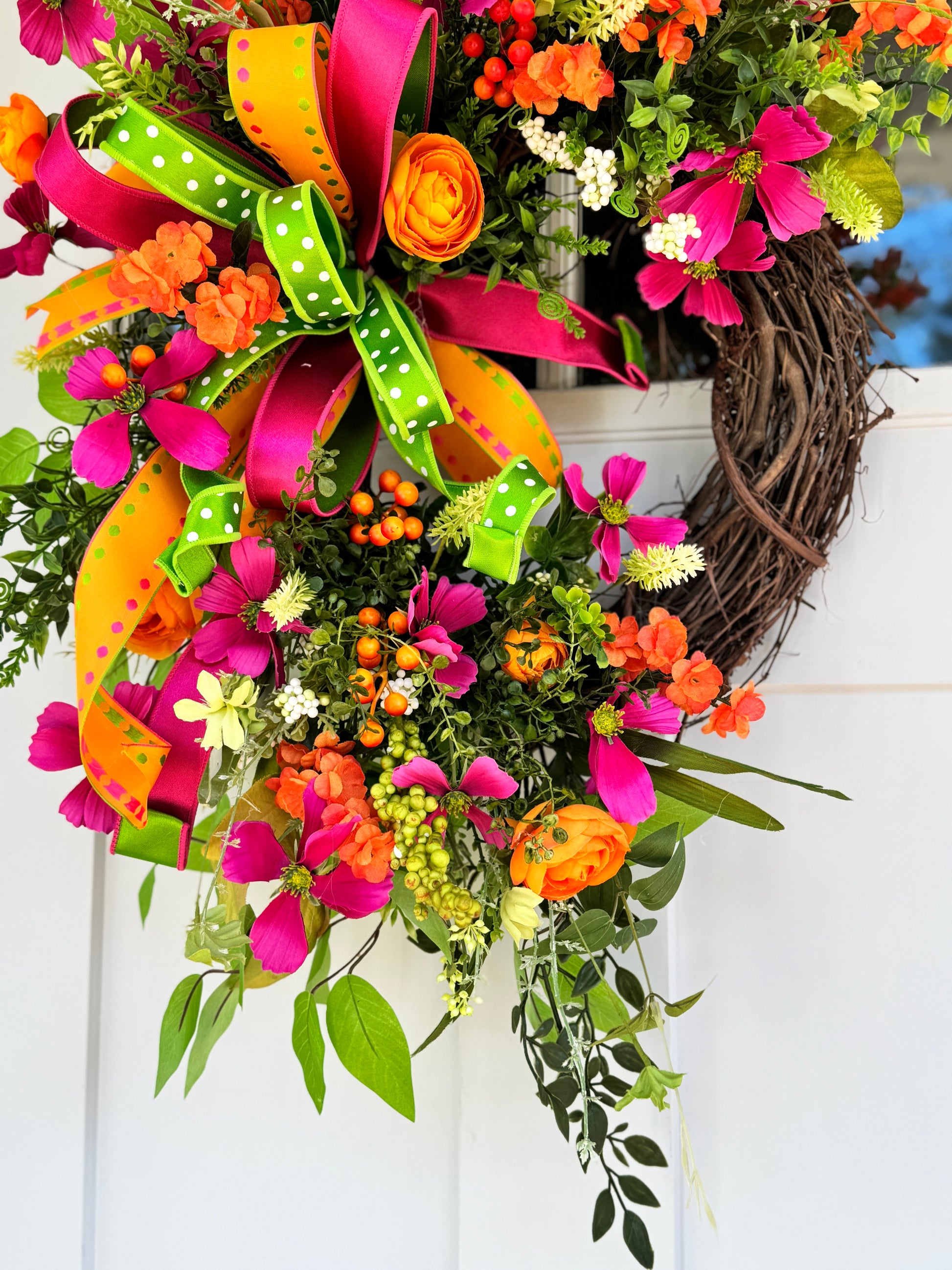 Brighten your door with this vibrant floral wreath. Features bold magenta cosmos and orange peonies, spring greenery Ana a large handmade bow made with two reversible Farrisilk ribbons of green with white polka dots and one magenta with green backing and a solid orange ribbon with magenta and green stitching. Sure to catch the eye of the neighborhood! Measures 24x27x8”