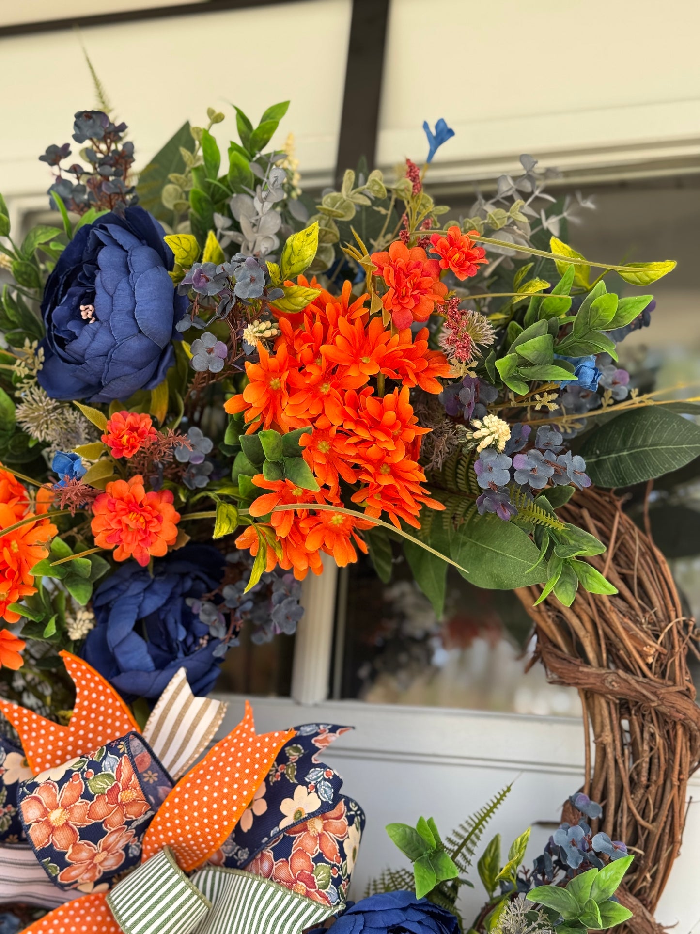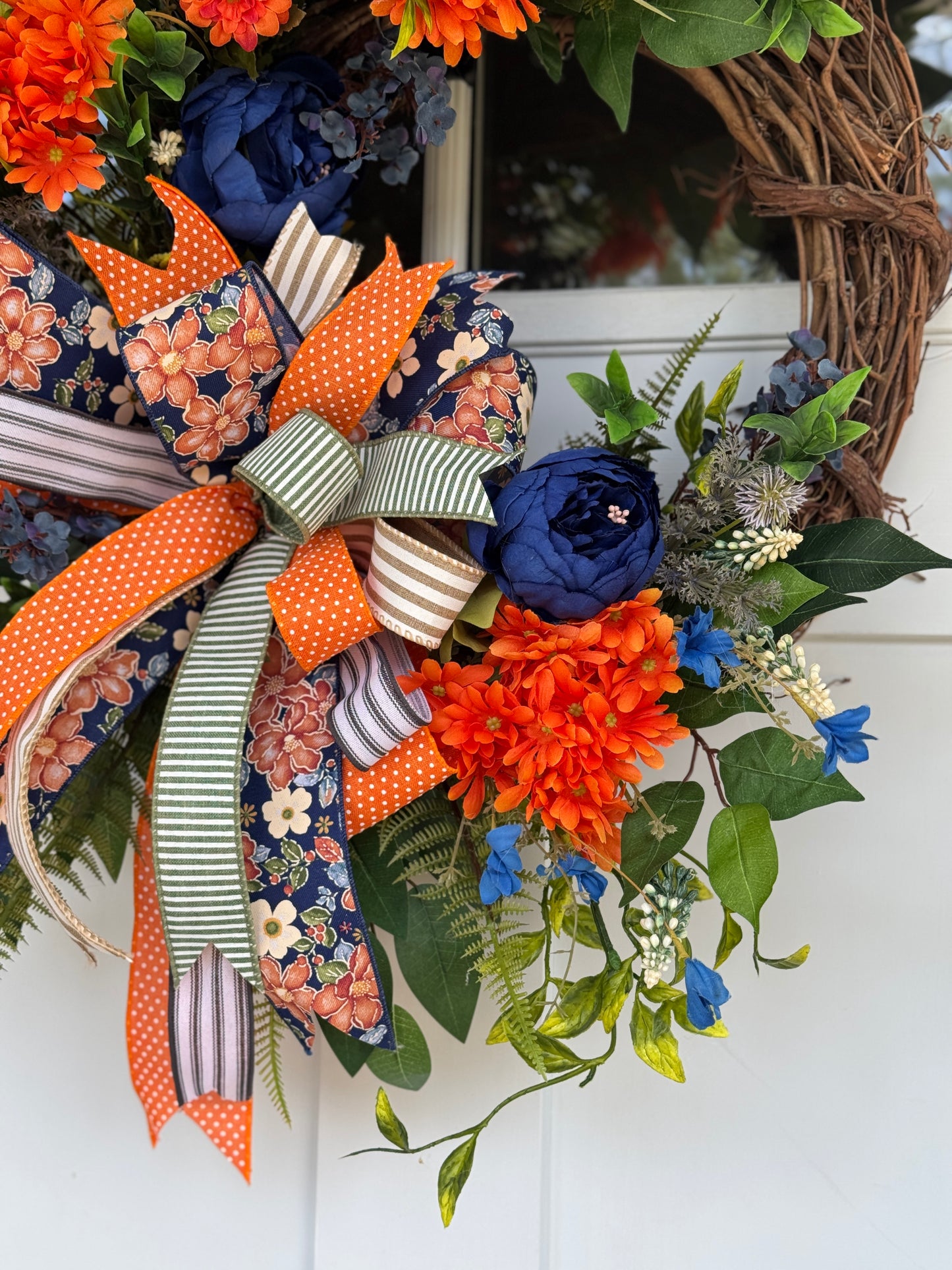 Beautiful wreath featuring vibrant blue peonies, orange hydrangea, mini blue flowers, fern, ruscus and ficus greenery. Handcrafted bow with cascading tails add charm. Perfect for adding a pop of color to your door. Measures 23x30x8”