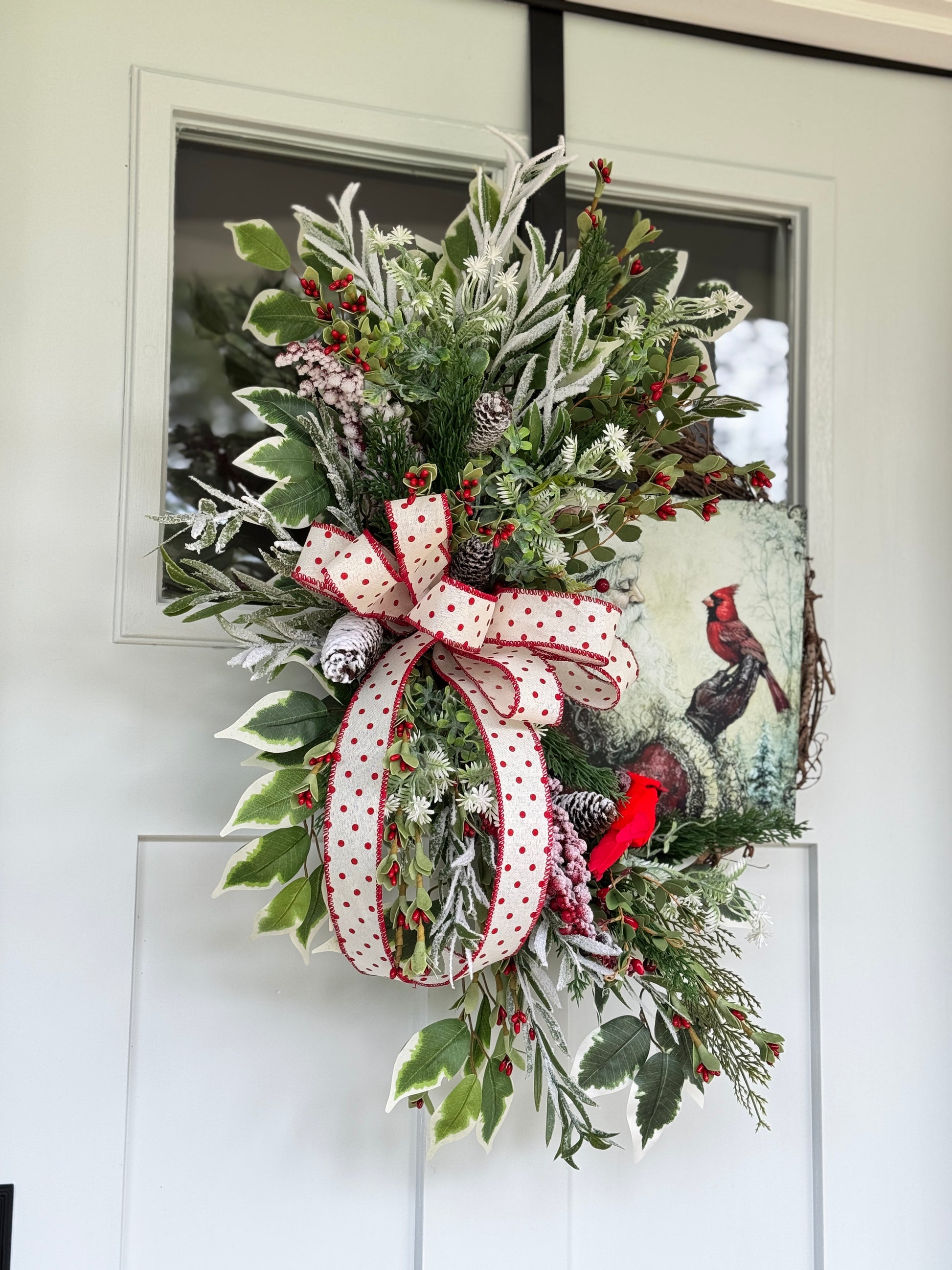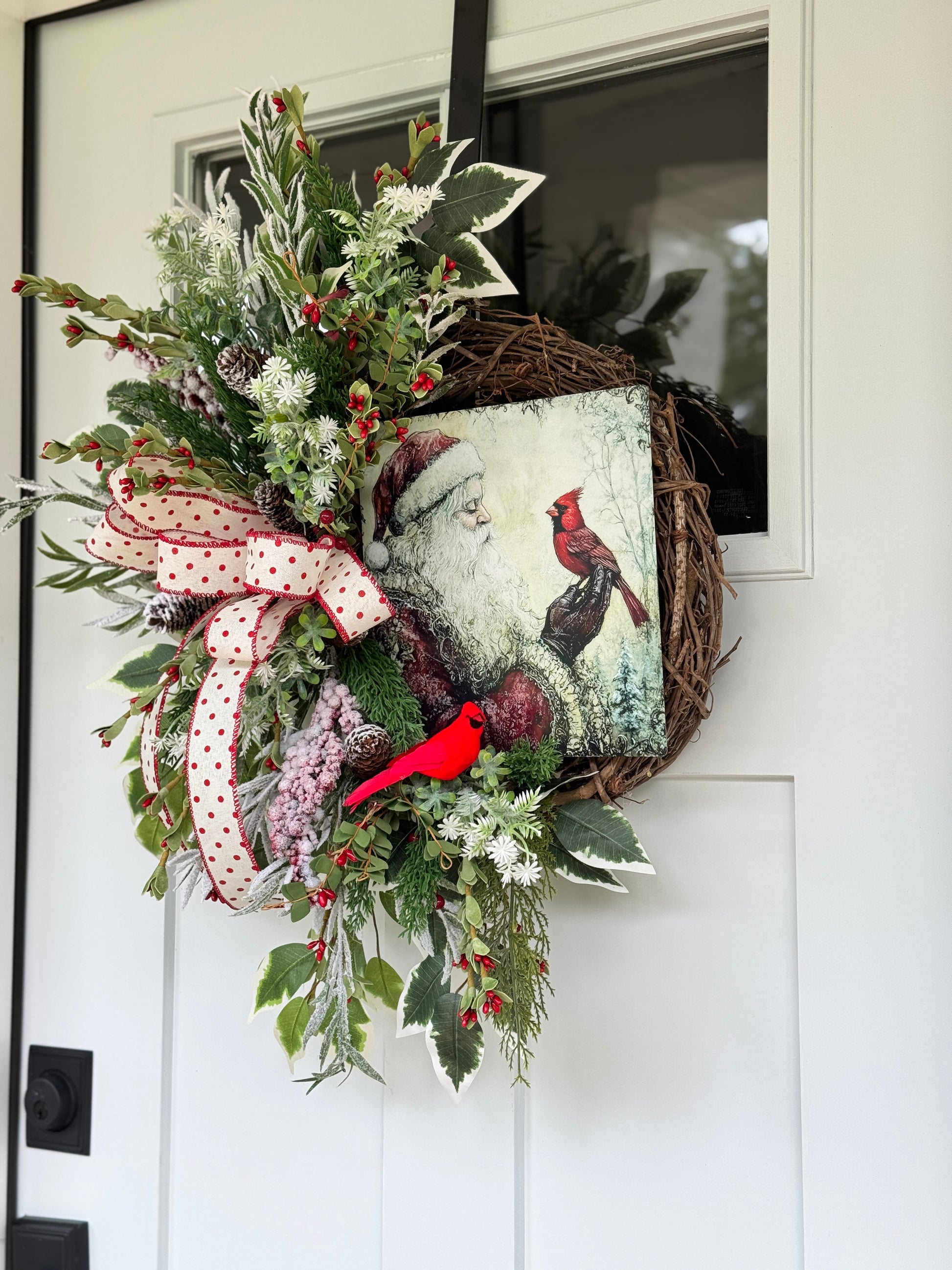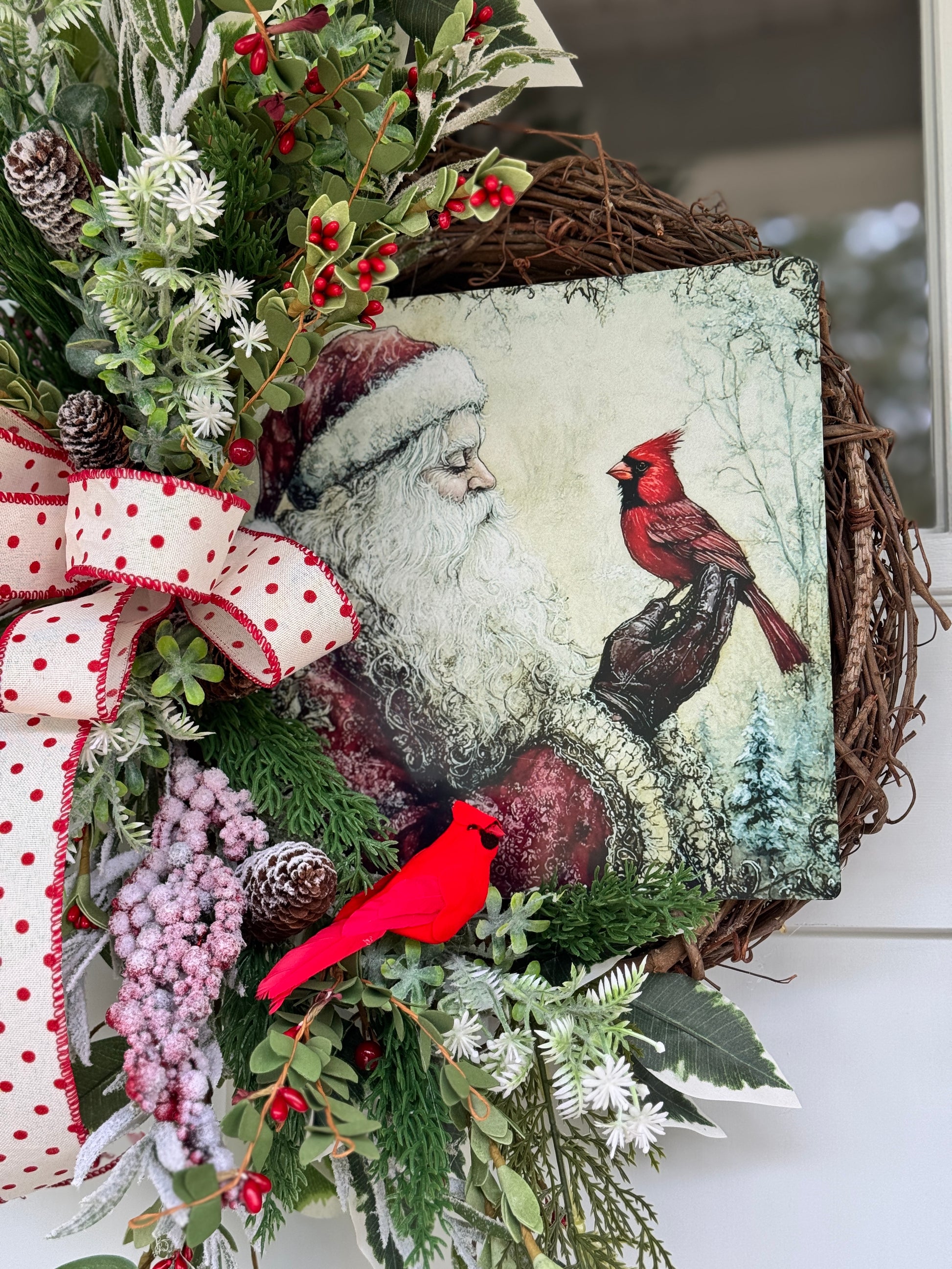 Celebrate the season with this beautiful holiday wreath featuring a charming Santa and cardinal vintage inspired design. Adorned with red berries, lightly snowed mixed greenery and ficus leaves with a Cardinal sitting on a branch and a handmade bow made of cream and red polka dots with an Americana touch. It's perfect for adding a soft, yet festive, touch to your home. Measures 18x29x8”
