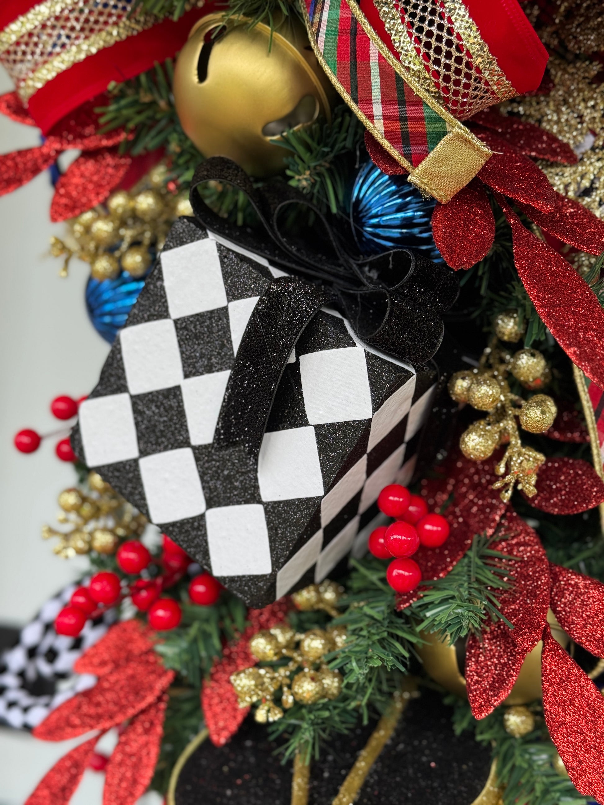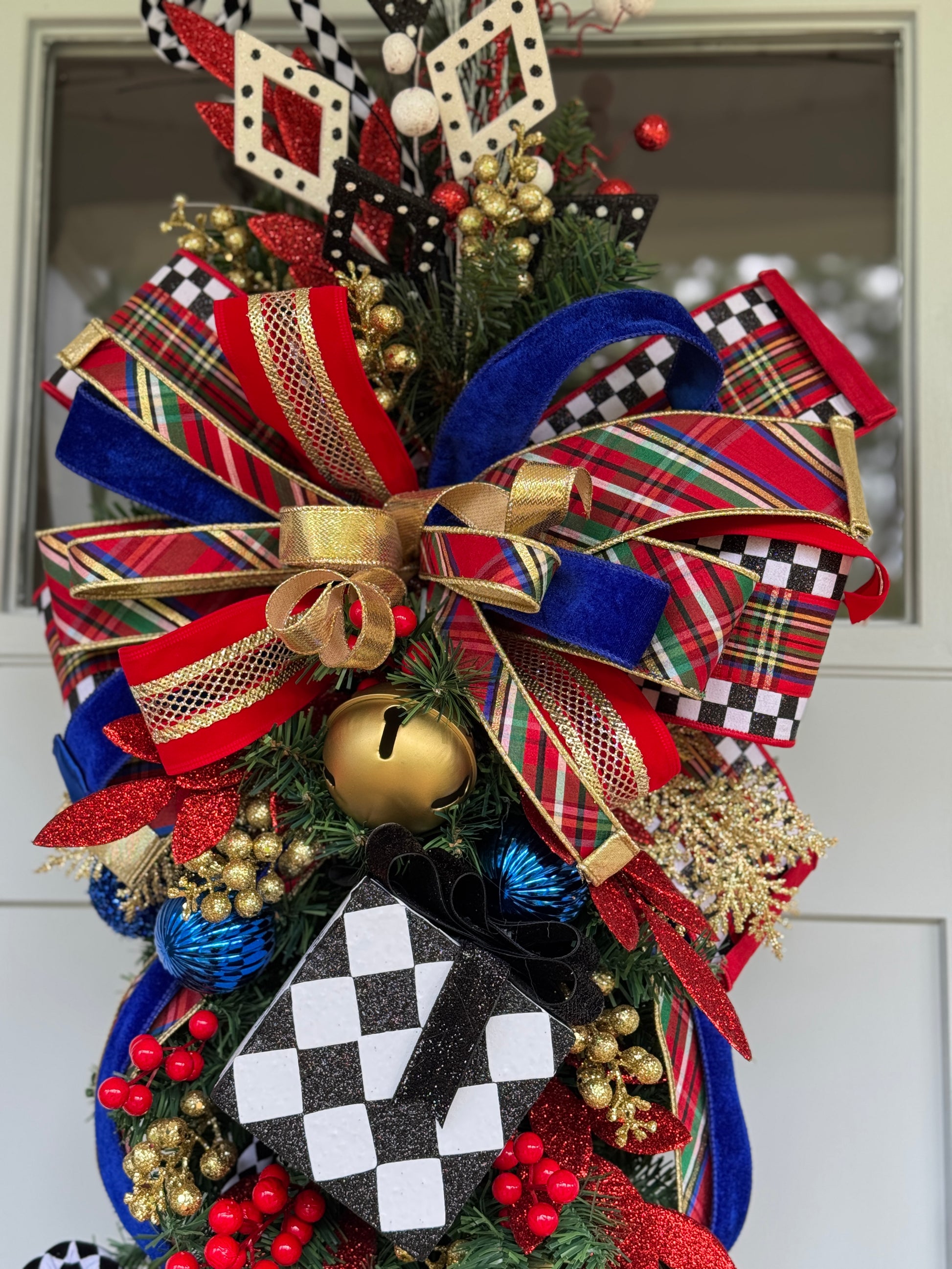 This XL Nutcracker Swag/Wreath will be a standout in the neighborhood with its vibrant color theme of red, cobalt blue, gold, black and white Harlequin and plaid. Features a harlequin pattern gift accent in black and white which adds contrast to the wreath along with the Nutcracker Harlequin pattern drum. Large handmade bow of D. Stevens and Farrisilk ribbons with tails cascading through the wreath. Accents include harlequin black and white curls, black and white diamond shaped accents, ornaments, gold bells, and more! Fabulous curb appeal with its rich tones, it's perfect for adding a festive touch to your home. Ideal for welcoming guests with seasonal cheer. Measures 19x48x11”
